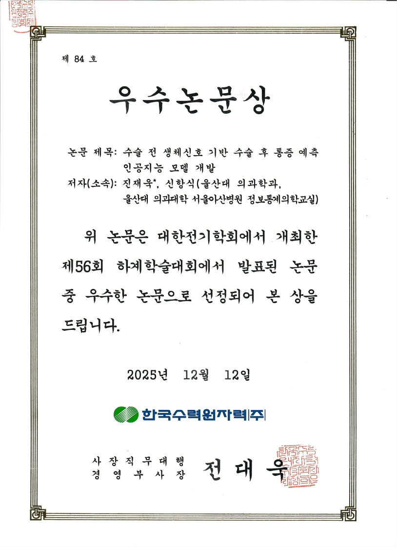 우수논문상 [Best Paper] Dec 12, 2025 Views: 진재욱 학생 (박사과정)이 2025년 대한전기학회 하계학술대회에서 발표한 ‘수술 전 생체신호 기반 수술 후 통증 예측 인공지능 모델 개발’로 우수논문상을 수상하였습니다🎊 Please enable JavaScript to view the comments powered by Disqus.
